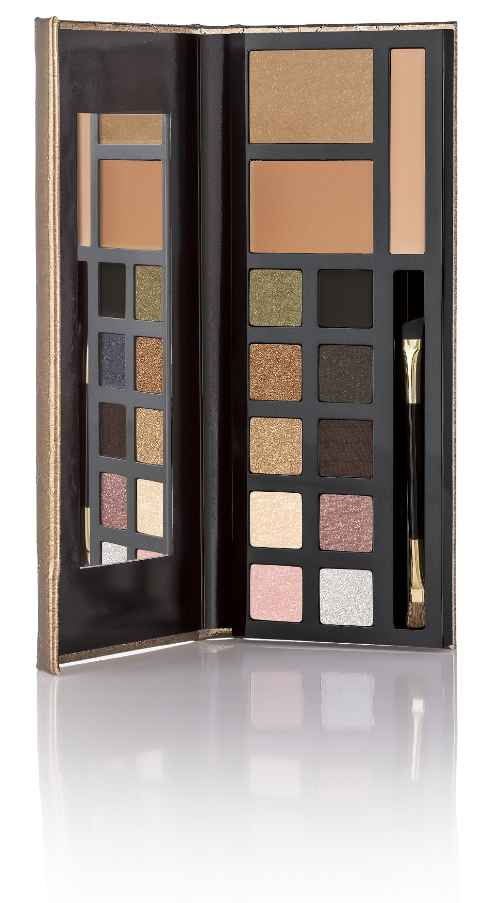 1° passo: Vamos aplicar dois tons de sombra – começamos com o mais pigmentado, um tom de dourado (que a Claudia ama). Passe na pálpebra toda, depois, com um pincel chanfrado, aplique na região inferior dos olhos fazendo uma linha suave embaixo dos olhos pra ter esse efeito bem radiante.