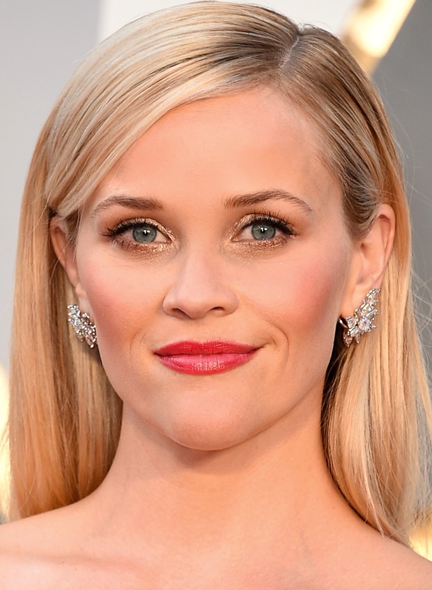 A tendência de maquiagem iluminada veio para o tapete vermelho para realçar a beleza de Reese Whiterspoon. “A maquiagem é clássica, mas com toques modernos que oferecem um ar elegante”, comenta Roosevelt Vanini. A atriz optou por uma pele natural, com olhos bem iluminados e um leve sombreado em tons de marrom. “Os olhos são construídos com um delineador de traço ultra fino combinado com muita máscara de cílios e sobrancelhas levemente definidas. A boca vermelha está linda com um tom cereja e o blush natural também está incrível marcando a diagonal do rosto”, diz. Por fim, Reese apostou no strobing, ou seja, no iluminador em pontos estratégicos – maçãs do rosto, têmporas e queixo para arrematar o visual.